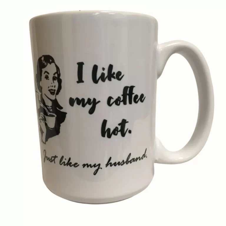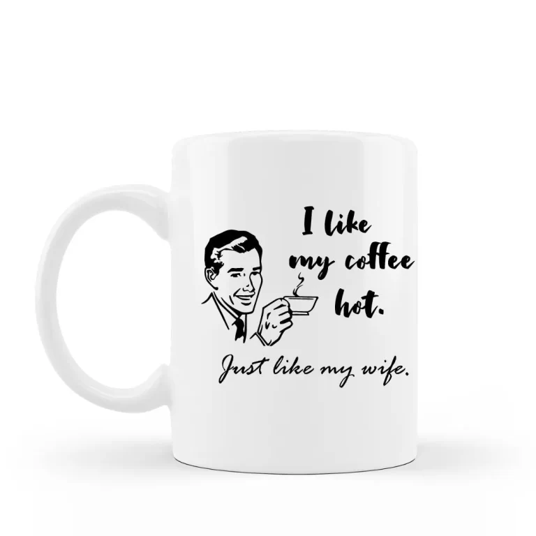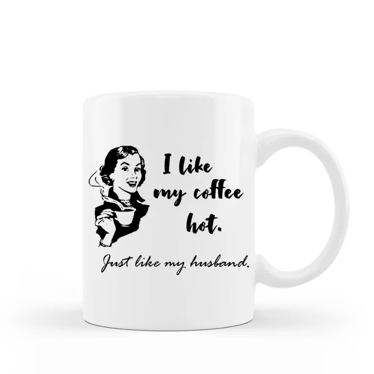 Funny retro coffee mug for your wife reads “I like my coffee hot. Just like my husband”.  This retro coffee