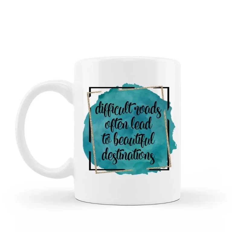 Difficult roads often lead to beautiful destinations inspirational sayings ceramic coffee mug.  This is a 15 ounce ceramic coffee mug