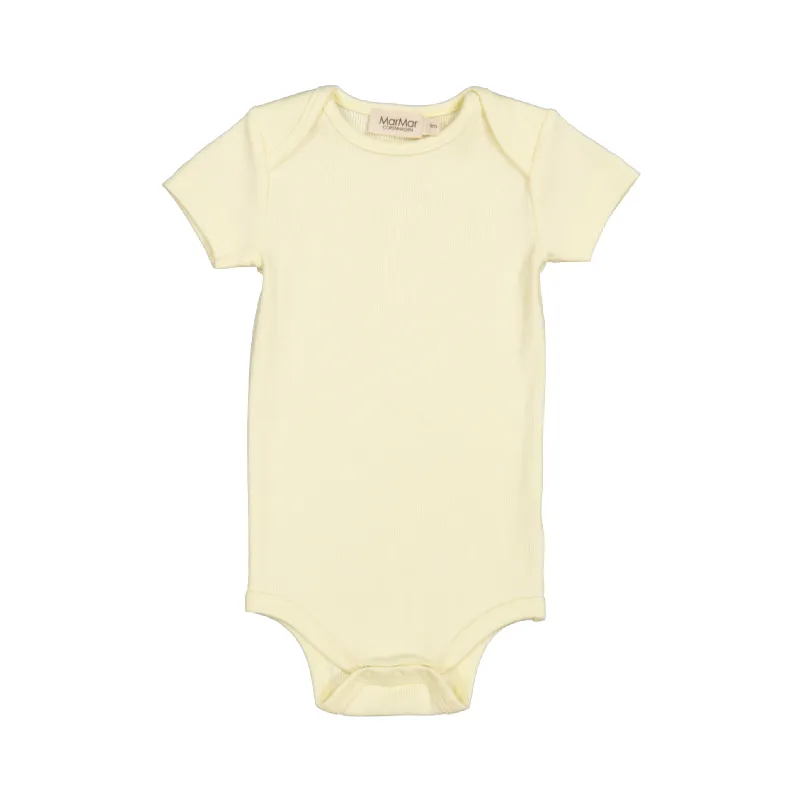 marmar copenhagen ben short sleeve baby body in limonade. this short-sleeved bodysuit is a light, sunny yellow with lapped shoulders
