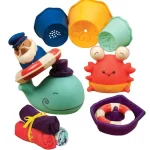 Includes 11 pieces: 3 stackable pots, 2 water-spitting creatures, 3 soft cloths, 1 boat with 1 captain, 1 life preserver.