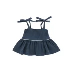 Fancy enough, but oh so comfy for everyday adventures, this peplum top with just enough cool details (cross tie at the back, contrast piping) is perfect with leggings or little bloomers.