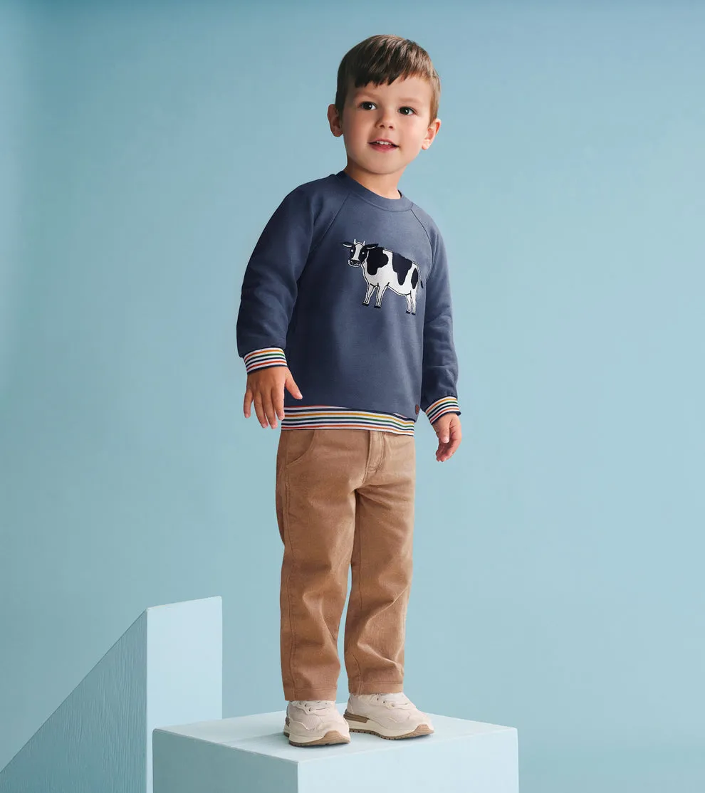 Get him something that will moo-ve with him with this charming pullover sweatshirt, featuring a large white and black cow crafted with a mix of knit and embroidery for a playful pop of texture. Set against a deep blue backdrop, it’s made from super soft French terry in a polyester-cotton blend that keeps him comfy from playtime to downtime. The crew neckline, long raglan sleeves, and boldly striped cuffs and hem, in black, yellow, green, blue, orange, and white, add a fun twist to this farmyard favourite.