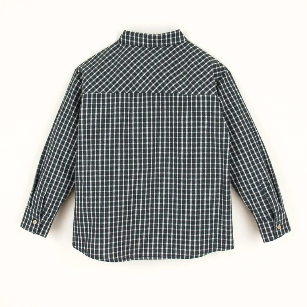 Collared shirt with pockets and yoke on the back. Wooden button front opening.