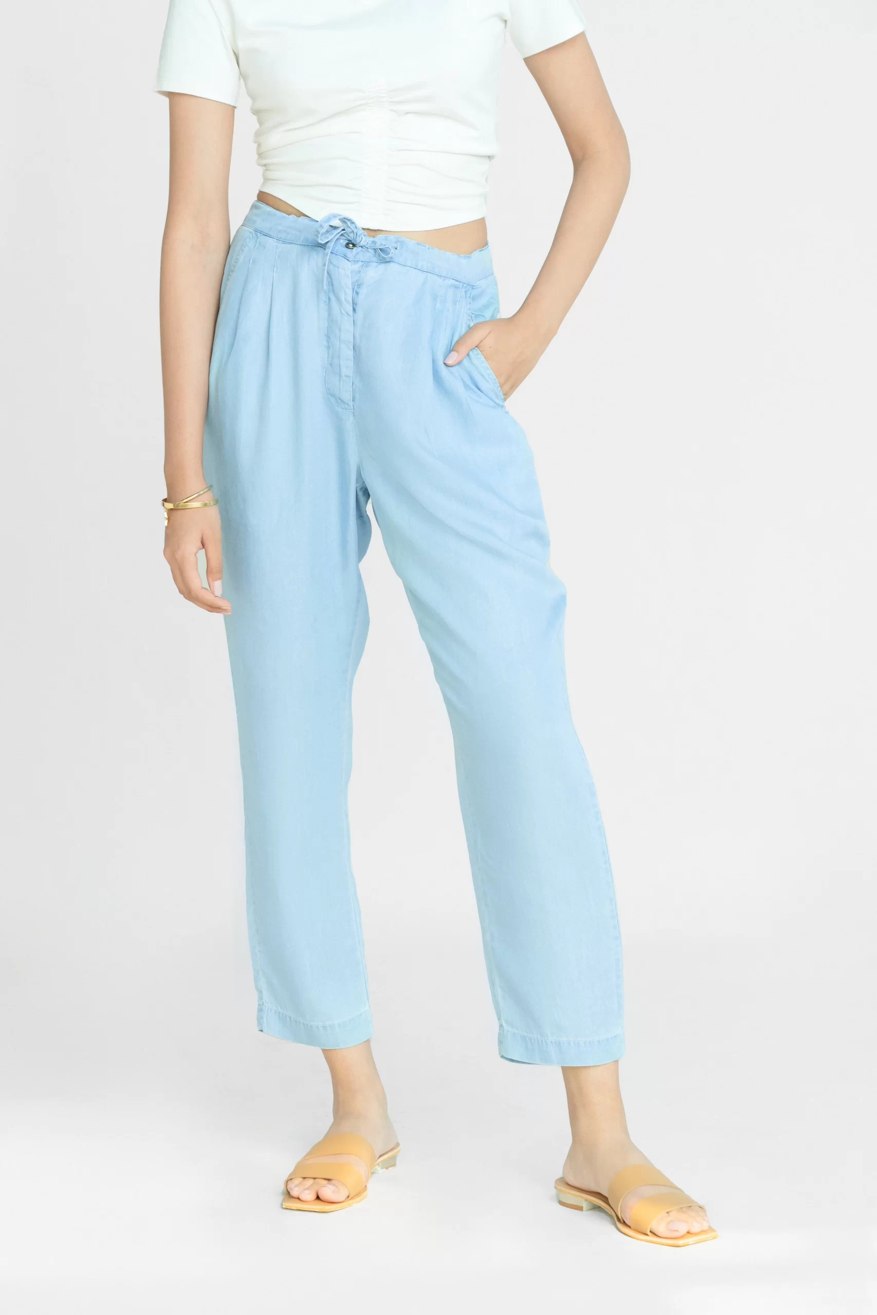Blankets on the Beach Tencel Pants With a drawstring waist and a discrete button fly, these straight-leg tapered pants with a high waist have a relaxed semi-fitted look. Made from 100% Tencel.