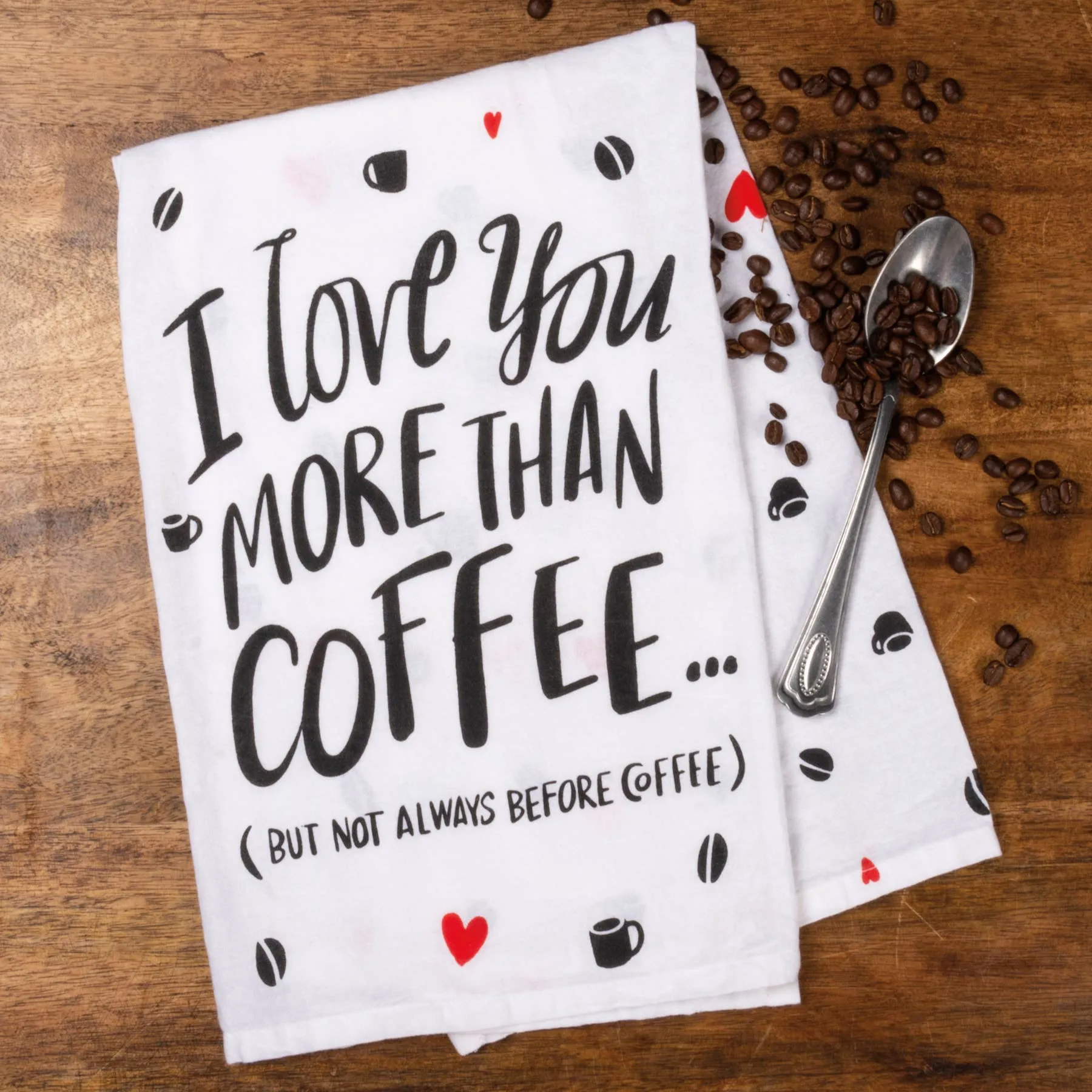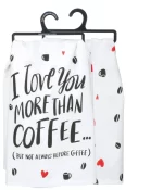 A cotton kitchen towel lending an “I Love You More Than Coffee (But Not Always Before Coffee) sentiment with heart, bean, and mug designs throughout. Machine-washable.