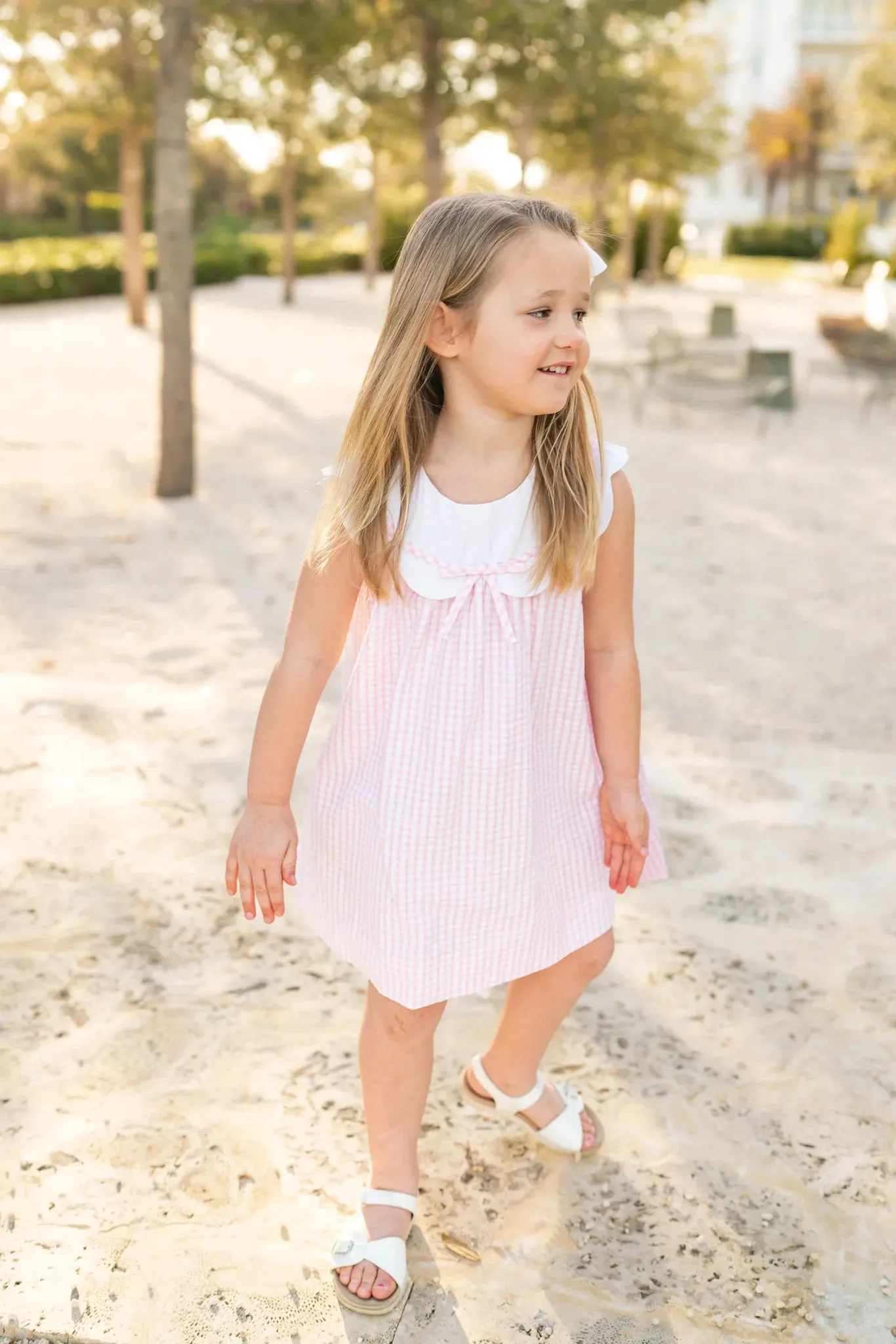 The Charlotte Scalloped Dress in Blakeney Ballet Pink Seersucker Check features the company’s signature scalloped yoke in crisp white pique with contrasting bias trim and center bow detail on the chest. This one is a classic beauty you’ll want to hold onto for your generations to come.