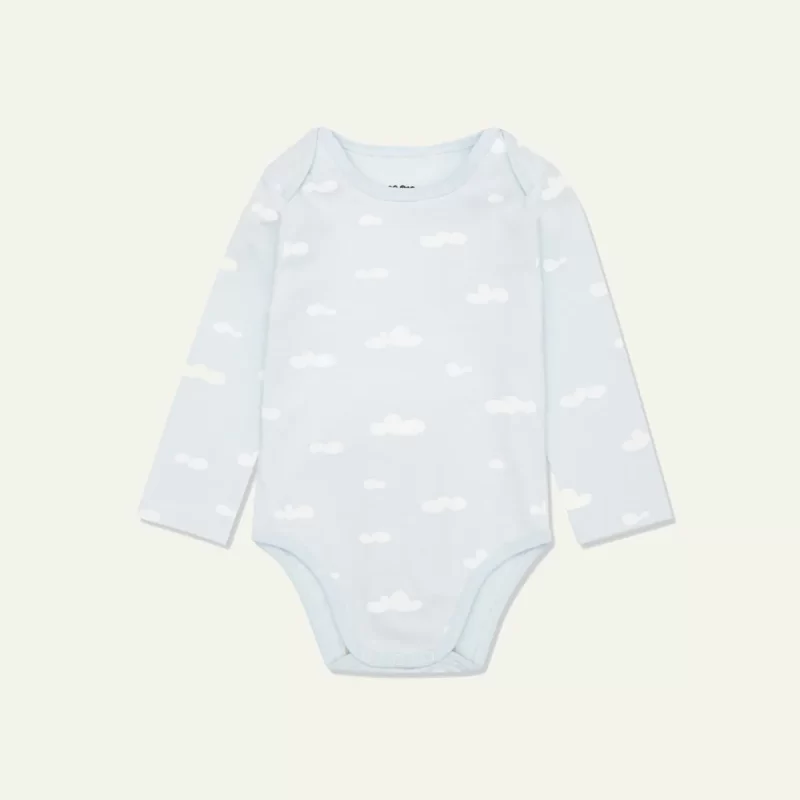 Blue ribbed long sleeve bodysuit with an all over cloud print in white. Made from the softest organic and upcycled