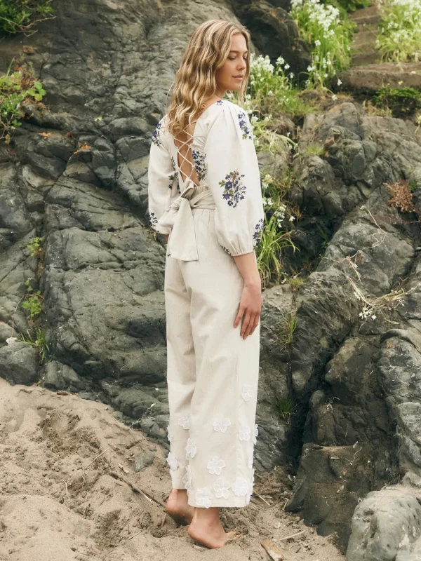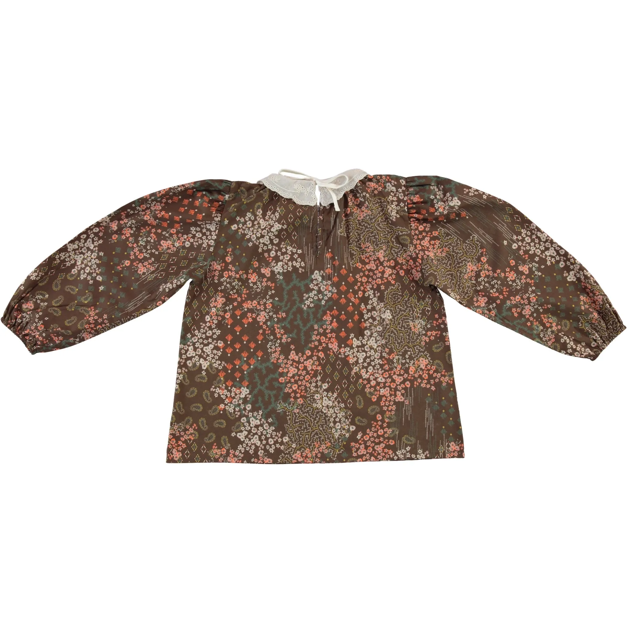 Adorable Darja blouse is crafted from softest lightweight cotton in signature ditsy floral patchwork print. Features embroidered antique collar in cotton, elegant balloon sleeves and ribbon tie closure in the back.