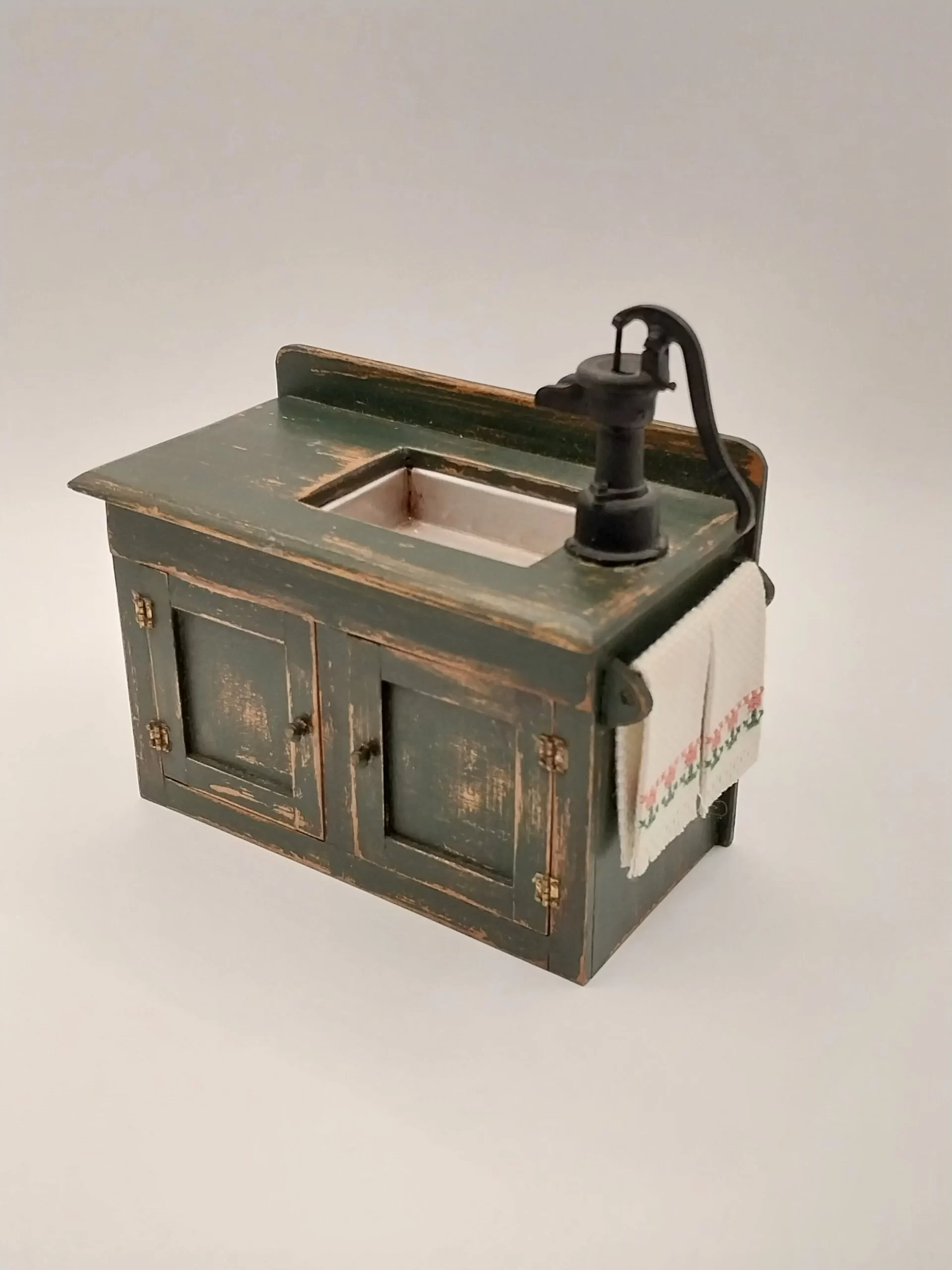 This 4 piece Distressed Green Colonial Kitchen Set includes Sink with pump, Shelf, Double hanging Cupboard, and Ice Box. Ice Box is done in a Walnut. Pieces are made by Artisan Joan Byers of CJ’s Miniatures. Pieces are signed by Artisan.