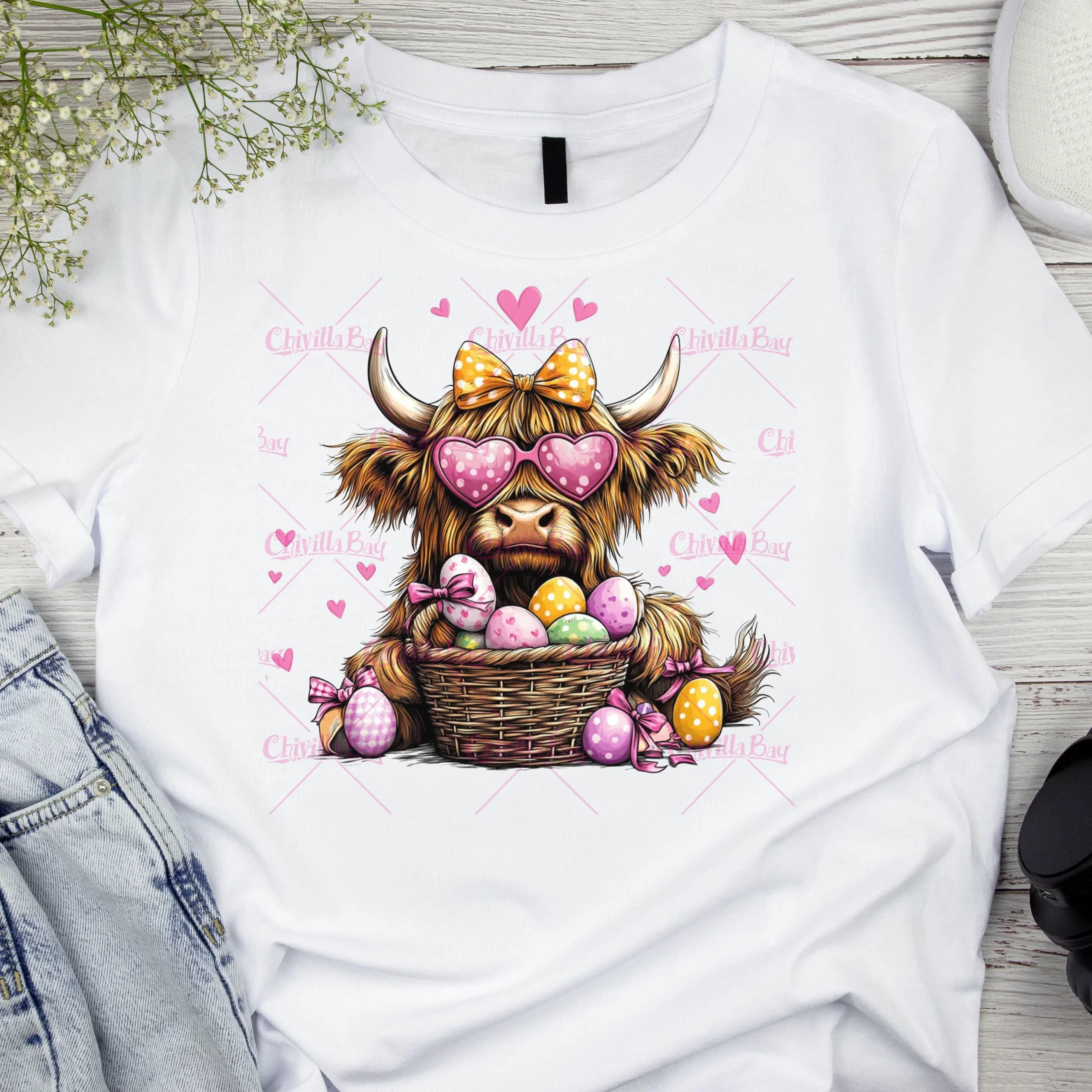Celebrate Easter in style with our Easter Day Highland Cow T-shirt! This adorable unisex white cotton shirt features a playful Highland Cow wearing a bright yellow polka dot bow and pink heart-shaped glasses, and carrying a basket full of pastel-colored Easter eggs. It’s perfect for adding a fun and quirky touch to your holiday outfit.