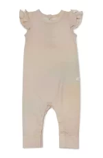 Made from our signature ultra-soft and sustainable Tencel™ Lyocell and organic cotton jersey knit fabric, our baby girl’s romper is as cute as it is comfortable. It features a ruffled shoulder with snaps opening on the back and bottom pants for easy dressing. This stylish romper is made for movers and shakers!