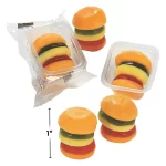 1″” Mini Gummi Burgers. Innavidually wrapped. (Approximately 38 pcs./unit) Dairy Free, Gluten Free, Kosher, and Nut Free.