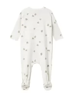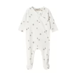 marmar copenhagen rubello baby onesie in soft white with an all over peace doves print. this sweet, footed onesie has a wrap front with snaps down the side.