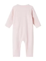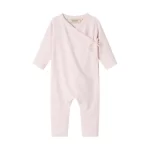 marmar copenhagen rula baby onesie in soft pink. this sweet onesie has long sleeves and legs, and has a wrap front with snaps down the side.