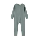 this marmar copenhagen zip rompy in dusty green is made of soft organic ribbed cotton for all-day comfort. it has long sleeves, a full front zip closure with a round neck and zipper tab for easy wear, plus cuffed ankles and wrists to keep the fit snug and cozy. perfect for everyday casual wear with a gentle, breathable feel.