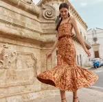 Luxurious lurex embroidery adorns this warm copper colored piece, giving a playful, fresh twist on embroidery for event dressing. Sparkle, like in the shimmery intricate floral embroidery in this motif