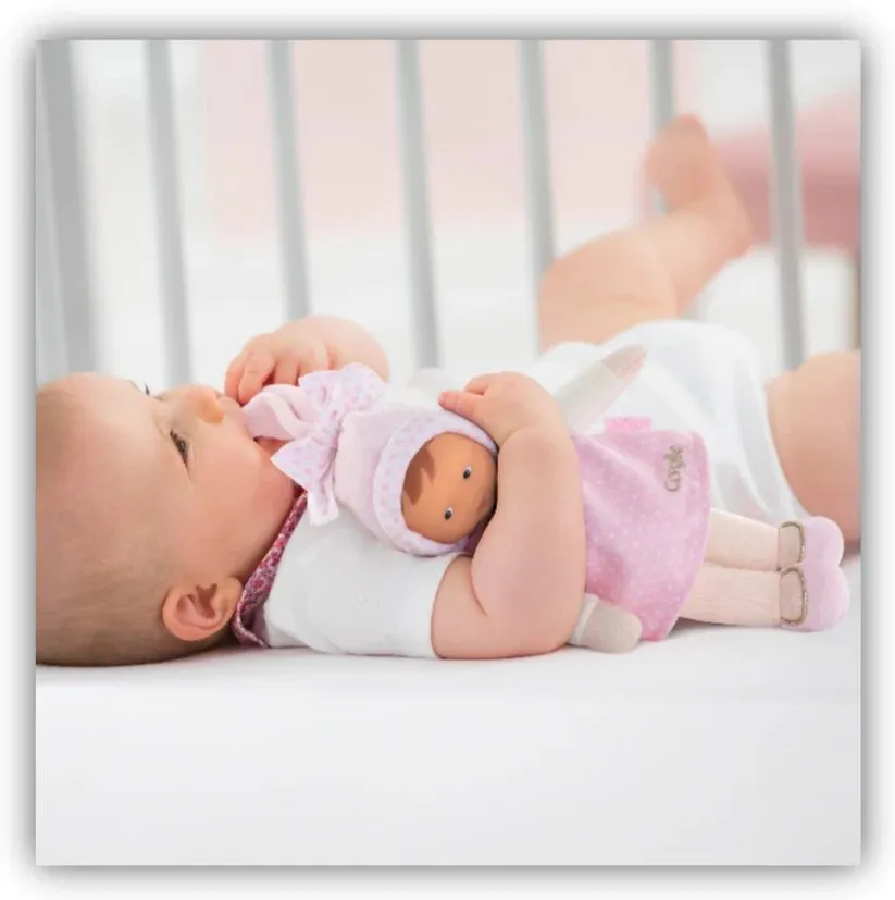 Its size (25 cm) allows little hands to grab and hold it by its bonnet, hat, arms, legs and even dress. She’s made from ultra-soft fabric, making her very cuddly. Her soft, realistic vinyl face charms and comforts baby, and is delicately scented with Corolle signature vanilla.