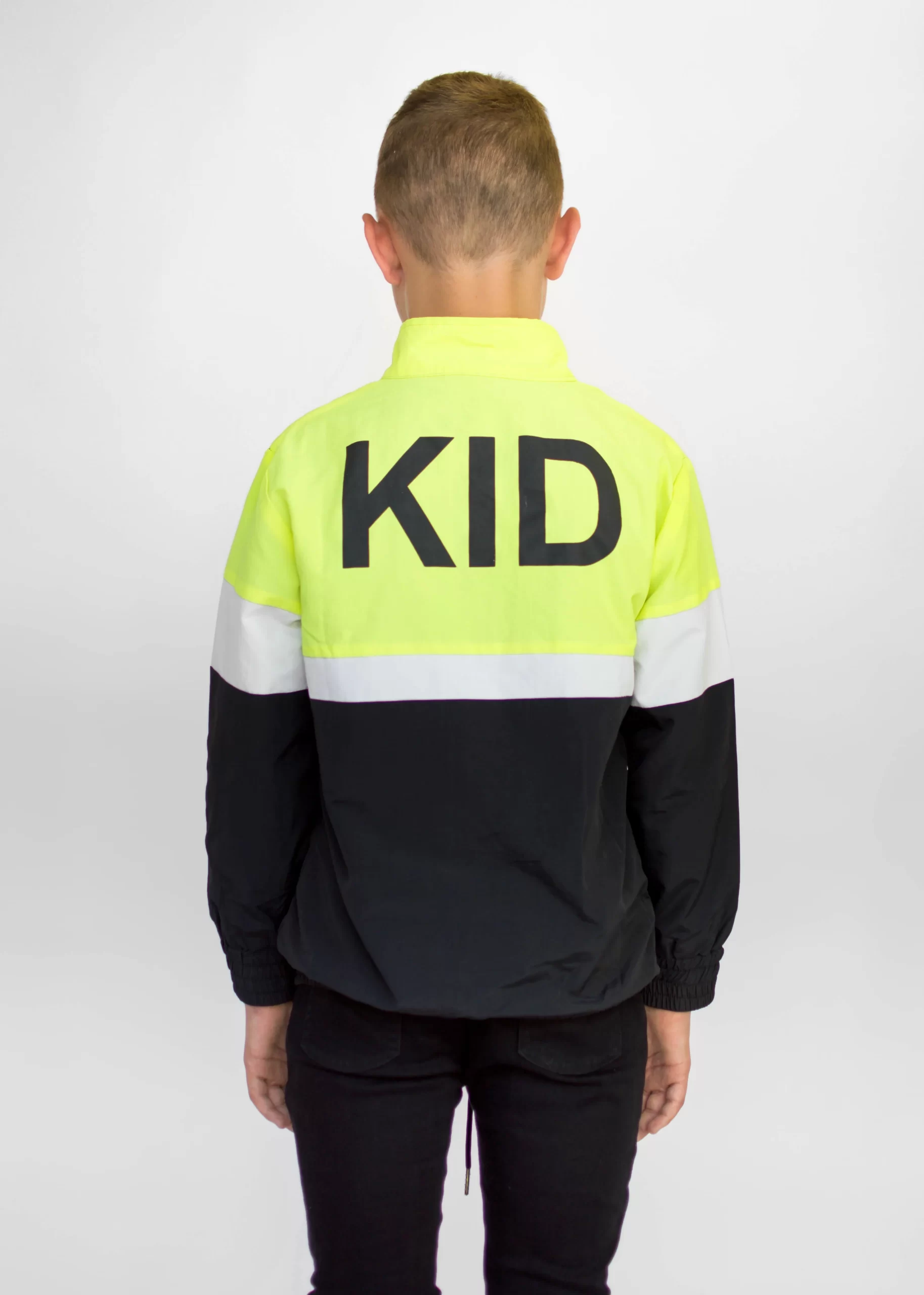Beaubella Kids neon shell jacket is cut to a relaxed, oversized fit and constructed from a hard shell 100% nylon. Our jacket features block contrasting panels, front breast and centre back ‘KID’ print and mesh lining inside.