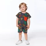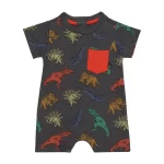 Printed French Terry Romper Charcoal Grey Multicolor Dinosaurs