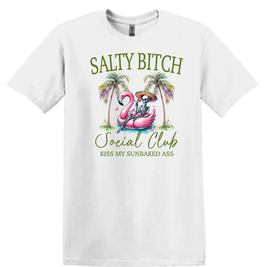 Join the “Salty Bitch Social Club” with our audaciously fun graphic tee! This shirt features a daring palm tree beach scene where a skeleton lounges on a flamingo floatie, cocktail in hand, under the bold statement, “Kiss My Sunbaked Ass.” Whether you choose the crisp white or playful pink cotton, this t-shirt is all about embracing your bold, carefree side. Perfect for beach days, pool parties, or whenever you feel like throwing a little shade with your style.