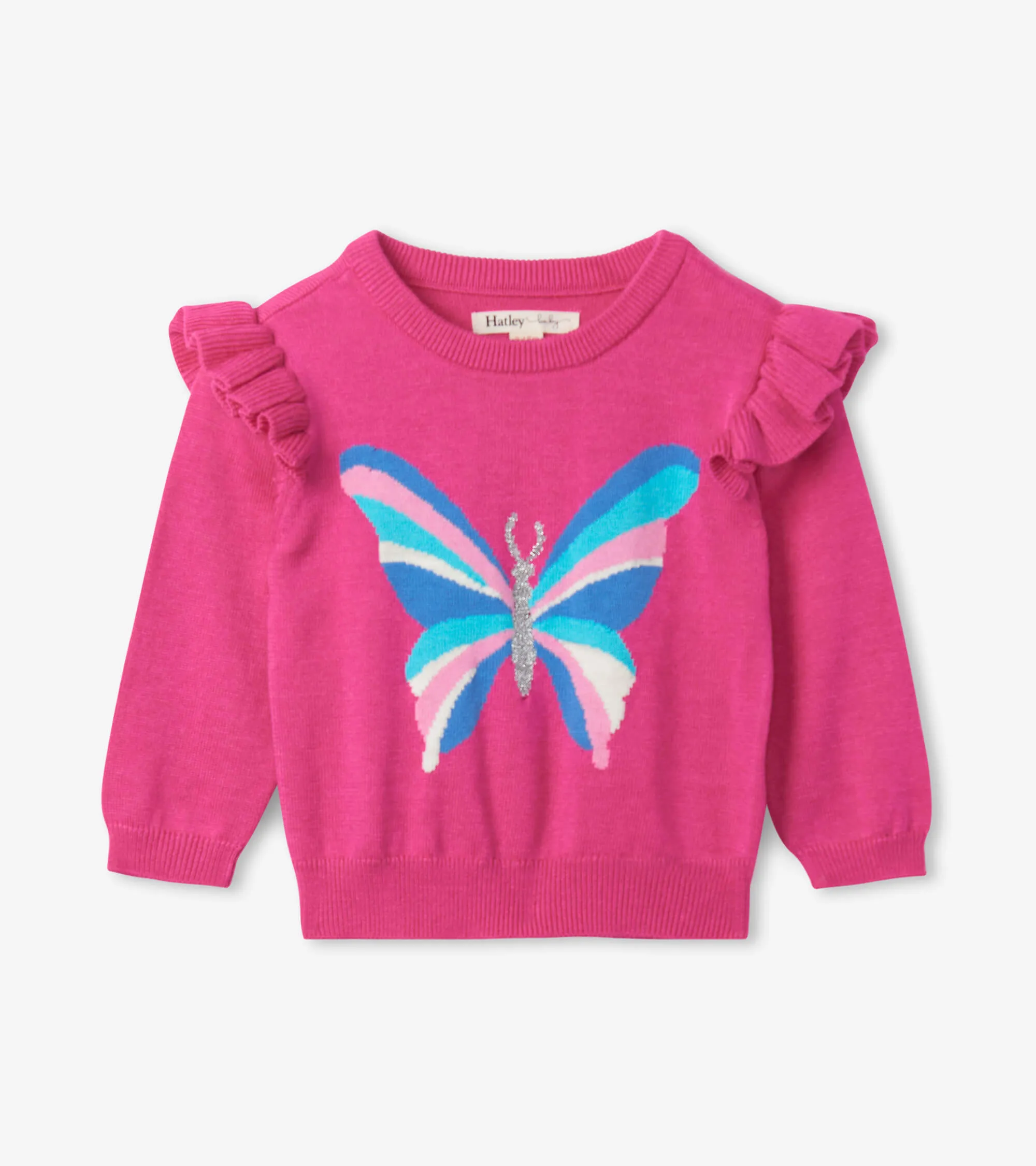 They Stripy Butterfly Baby Ruffle Sleeve Sweater from Hatley is the brightest and fun girls jumper this winter! Playtime is just a pretty ruffle away thanks to this adorable sweater! Featuring delicate ruffles, a charming collar and cozy cuffs and hems, it’s just what they need for their day-to-day wardrobes.