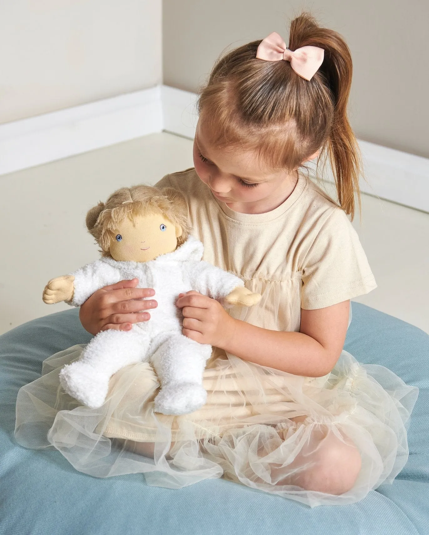 Really cute little doll in a fluffy bunny onesie. The baby doll is weighted so she can sit easily and made from soft jersey, wearing a fluffy bunny style baby grow. Remove the outfit to find a soft white removable nappy! Complete with a lovely embroidered face and realistic woollen hair, this baby doll is perfect for pretend play. Great for popping into a pram and going on a stroll, or simply just as a friend at a pretend tea party, Lilli doll will not disappoint.