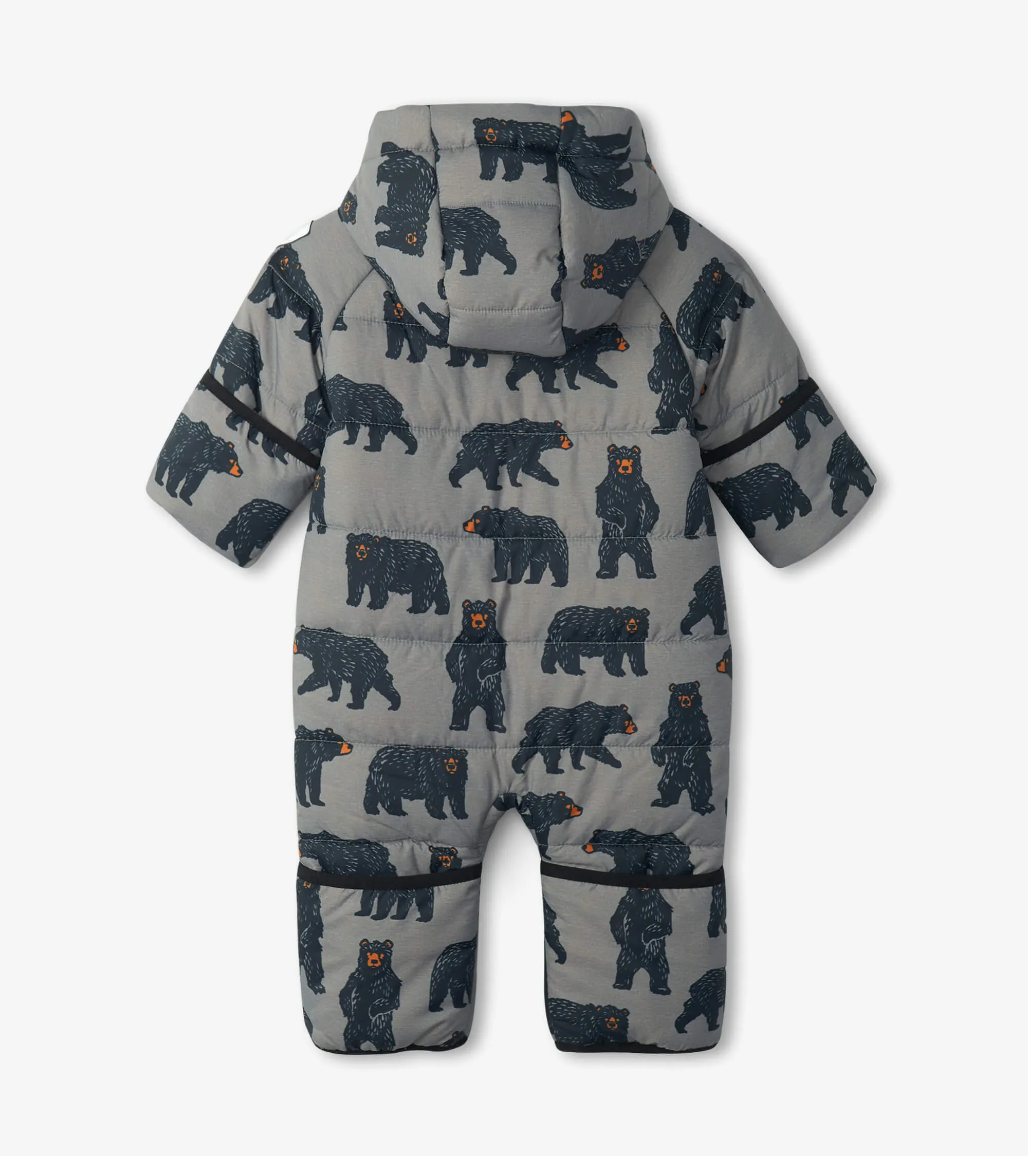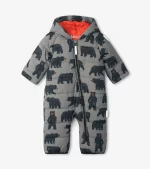 The Wild Bears Baby Winter Bundler from Hatley is the ultimate outerwear for Babies! This suit is perfect for keeping babies warm and dry during outdoor winter adventures. Its a puffer suit for babies! Features hands and feet that fold over making sure that little toes and fingers are warm and cosy.