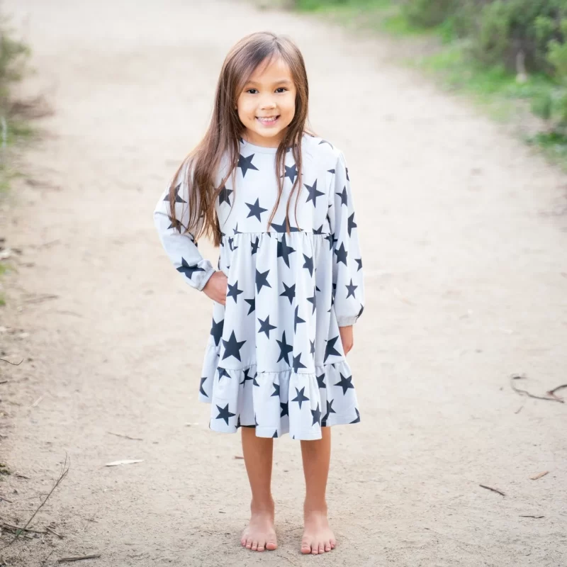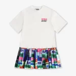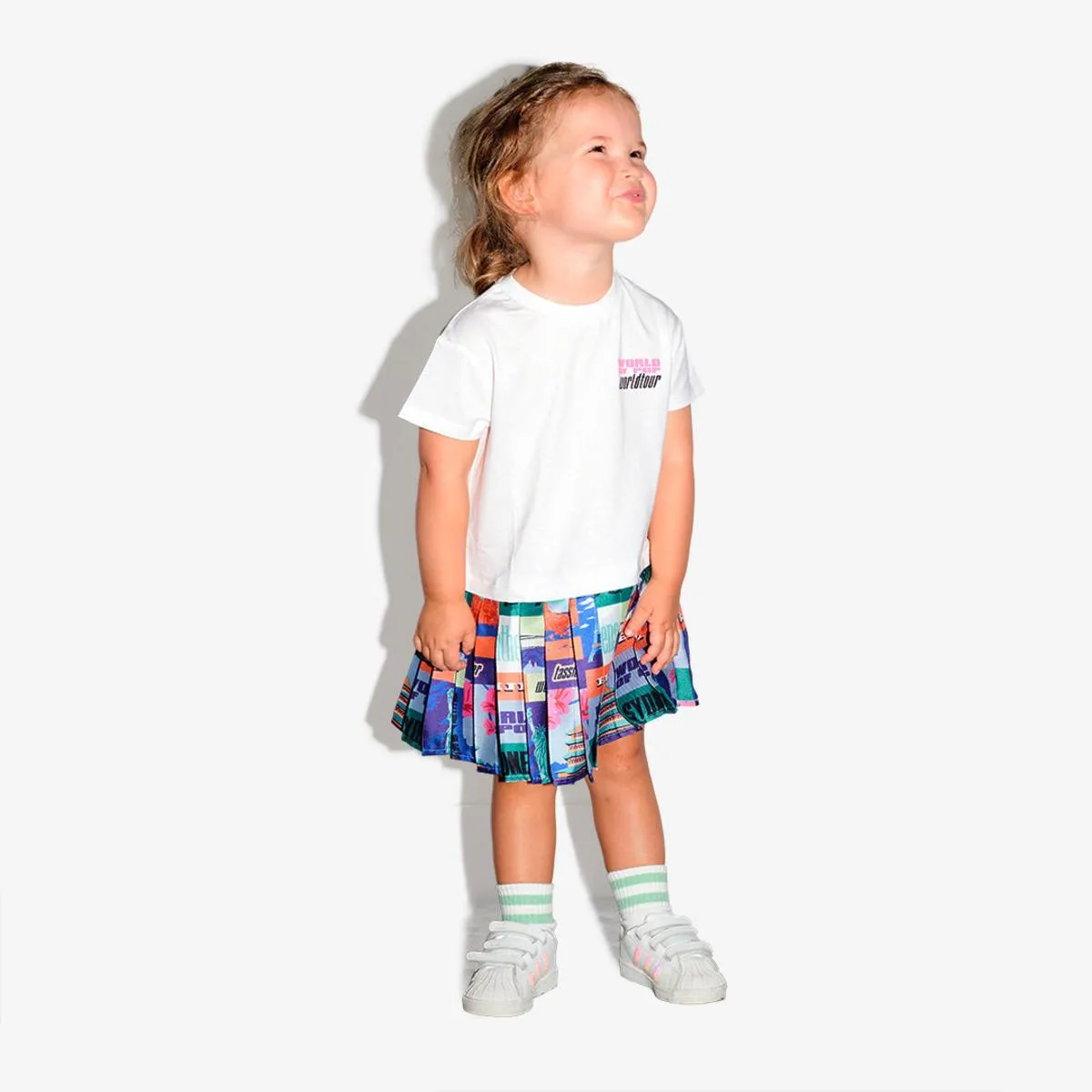 with this dress, little girls can change their style in the blink of an eye. How ? By adding or removing the upper part. Indeed, the “World Tour” printed skirt remains in place, while the black sweatshirt can be removed to reveal the high white below according to your preferences and weather conditions.